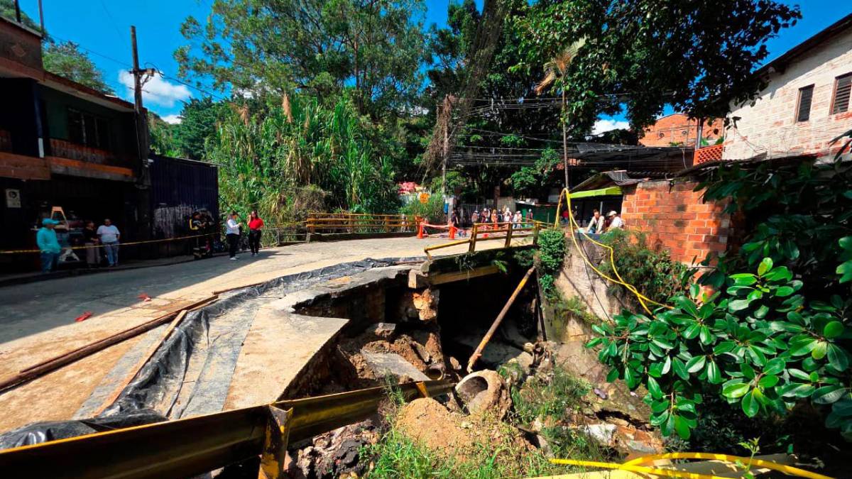 Así luce el daño del puente de la quebrada La Limona, entre Medellín e Itagüí. Por el carril que no sufrió afectaciones solo se permitirá el paso de motos por horarios, según el sentido. FOTO: CORTESÍA
